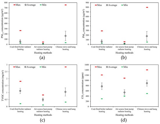 - According to the statistical results of the on-site tracking tests for 300 rural houses in northern Shanxi, the exceedance rates of PM2.5, PM10, TVOC, and CO2 of coal-fired boiler radiator heating were 64%, 37%, 58%, and 22%, respectively. The exceedance rates of PM2.5, PM10, TVOC, and CO2 of air-source heat pump radiator heating were 0%, 0%, 17%, and 6%, respectively. The exceedance rates of PM2.5, PM10, TVOC, and CO2 of Chinese stove–kang heating were 85%, 76%, 63%, and 38%, respectively, and the data distribution for each indoor pollutant was relatively decentralized.