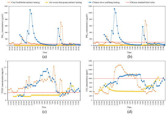- The indoor PM2.5 and PM10 concentrations from Chinese stove–kang heating varied greatly within the day and showed intermittent peak fluctuations that far exceeded the standard limits in the initial period of fuel combustion. Coal-fired boiler radiator heating had lower PM2.5 and PM10 pollution levels compared to Chinese stove–kang heating. The PM2.5 and PM10 concentrations from the air-source heat pump radiator heating varied very little within the day and remained below the standard limits. The indoor TVOC concentrations from coal-fired boiler radiator heating and Chinese stove–kang heating were maintained at comparatively high levels throughout the night, far exceeding the limit of 0.6 mg/m3 stipulated in the referenced standard [38]. With doors and windows closed tightly at night, the indoor CO2 concentrations from these two heating methods exceeded the standard limit of 1000 ppm [38].