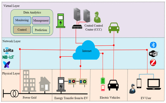 The physical layer consists of electric vehicles, charging stations, and other facilities. Sensor nodes and measuring devices are used to connect different entities in the physical layer to the network layer which transmit data such as traffic condition, vehicle speed and position, and status of charging stations. The network layer enables the communication and interaction between the physical layer and the virtual layer using different short-range and long-range communication technologies. At the virtual layer, different servers for data storage and decision-making tasks are used to support different services to the end user and the service provider. Both real-time data and historical data are used to develop energy efficiency solutions, smart charging algorithms, etc.