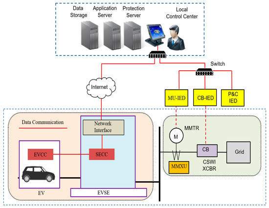- Aftab, M.A.; Hussain, S.M.S.; Ali, I.; Ustun, T.S. IEC 61850-Based Communication Layer Modeling for Electric Vehicles: Electric Vehicle Charging and Discharging Processes Based on the International Electrotechnical Commission 61850 Standard and Its Extensions. IEEE Ind. Electron. Mag. 2020, 14, 4–14. [Google Scholar] [CrossRef]