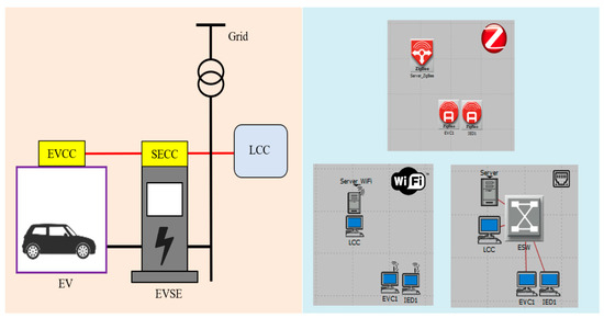 The IEC 61850 standard has been used for modeling different smart grid components. In this work, based on the IEC 61850-90-8 standard (object model for e-mobility), we defined the logical nodes for the electric vehicle system [21,22,23]. The logical nodes contain the information related to monitoring and controlling the electric vehicle (EV) and electric vehicle supply equipment (EVSE), as shown in Table 2 and Table 3. In order to coordinate the communication between electric vehicle and charging station, the electric vehicle is equipped with electric vehicle communication controller (EVCC) while charging station is equipped with supply equipment communication controller (SECC) at the station side, as shown in Figure 4. The e-mobility operator is the legal entity which maintains and operates the charging stations.