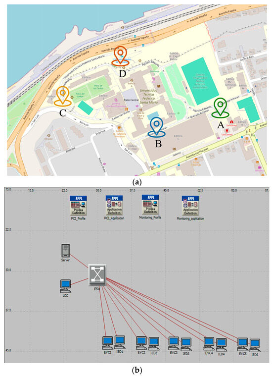 (a) Locations of charging stations in parking lots (A–D) at UTFSM campus, Valparaiso, Chile; (b) the simulation model of communication network.