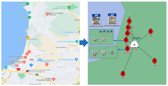 We also considered the scenario of Vina del Mar City, Chile. There are different charging stations which are geographically distributed in the city. The developed communication model considers that each charging station is connected to a local control center (LCC) through a local area network (LAN) and the LCC is connected to a centralized local control center (CCC) via a router device. We developed the communication network model based on the available information, on Google Maps, for the number and the locations of electric charging stations, as shown in Table 10. Figure 8 shows the map of Vina del Mar City, Chile, while Table 9 shows the name, location, and specifications of each charging station. Only seven stations were considered because they have complete information while other stations have been discarded.