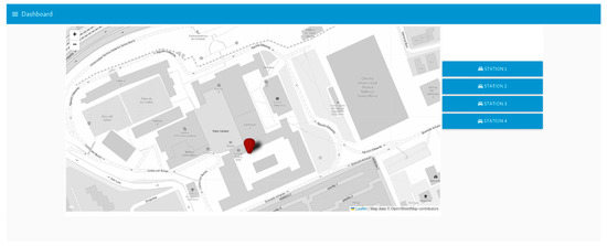 The developed testbed, shown in Figure 9, consists of an edge-based middleware system, utilizing a Raspberry Pi Model B as the MQTT broker, paired with a local PC for data processing. The Raspberry Pi runs Eclipse Mosquitto (https://mosquitto.org/, accessed on 3 July 2024), enabling the communication between the SONOFF devices and the PC. On the PC, we created a Node-RED dashboard for real-time monitoring of the charging stations, complemented by a MySQL local database for storing the historical data. Figure 10 shows the platform’s main dashboard showing the location of the charging stations and four bottoms to access their consumption information. By clicking on each of the charging stations, we monitor in real-time the power, current, energy, and voltage, as shown in Figure 11. Data from charging stations were emulated by using appliances with similar on/off behavior.