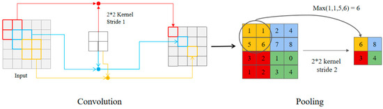 The convolutional layer is a fundamental component of a convolutional neural network (CNN). It employs a set of learnable filters (also known as convolutional kernels) to perform convolutional operations on input data. Each filter can detect specific features within the input data. The calculation process for convolution is illustrated in Figure 1. In this example, we have a 2 × 2 convolutional kernel. With a stride of 1, the kernel slides one unit to the right until it reaches the rightmost edge of the input matrix. Then, it moves one unit down and returns to the leftmost side, repeating the rightward movement. At each step, the kernel multiplies the corresponding numbers in the input matrix and adds them up. Pooling layers are used to reduce data dimensions and computational complexity. Figure 1 also demonstrates max pooling, where a 2 × 2 region selects the maximum value for output.