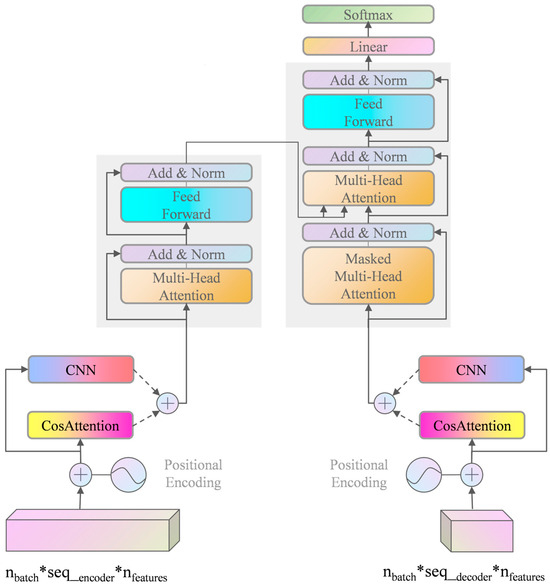 The CA-Transformer prediction model combines the traditional RNN and self-attention mechanism, fully leveraging the advantages of both. Through a parallel structure, it fully utilizes the characteristics of different models, enhancing the diversity and robustness of feature representation. Compared to a single-model structure, this design can more comprehensively mine data features. The RNN excels at handling the dependency relationships in sequential data, while the self-attention mechanism can better capture global information and long-distance dependencies. The self-attention used here employs cosine similarity instead of the dot product as the measure of self-attention, which can better capture similarities in time-series data. Finally, after merging multiple feature representations, they are input into the Transformer model. This method can fully utilize the Transformer’s powerful capabilities in feature extraction and sequence processing, further improving prediction performance. The architecture of the CA-Transformer prediction model is shown in Figure 2. In the input data, nbatch denotes the batch size, seq_encoder and seq_decoder represent the sequence lengths of the input encoder and decoder, respectively, and nfeatures signifies the number of meteorological factor features.