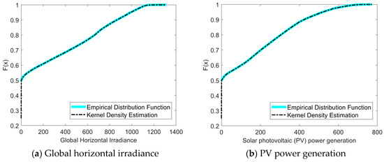 There are many meteorological factors affecting photovoltaic power generation. Due to space limitations, this paper only presents the correlation analysis results of total horizontal radiation and photovoltaic power generation. To solve the Copula function, it is necessary to obtain the marginal distribution of the random variables, which can be obtained by parametric or non-parametric methods. This study used the non-parametric kernel density estimation method to process the data, and the obtained empirical distribution function and kernel distribution estimation are shown in Figure 3. Then, from the obtained kernel distribution estimation function, the marginal distribution of the random variables is calculated, and the parameters of the Copula function and its corresponding rank correlation coefficient are estimated from this marginal distribution estimation.