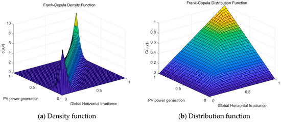 There are many commonly used Copula functions. This paper uses five commonly used Copula functions: Normal Copula, t-Copula, Gumbel Copula, Clayton Copula, and Frank Copula. Using them, we separately establish the joint distribution model of total horizontal radiation and photovoltaic power generation. Then, according to the marginal distribution, the maximum-likelihood estimation method is used to estimate the parameter values of the model. The obtained density function and distribution function are shown in Figure 4.