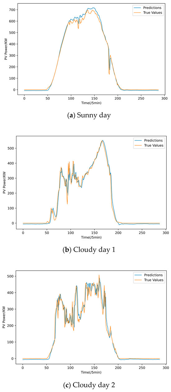 As can be seen in Figure 5, the model’s predicted values closely match the actual values, and the trends are generally consistent. This indicates that the CA-Transformer photovoltaic power generation prediction model can accurately predict the power generation trend under different weather conditions, demonstrating strong predictive and generalization capabilities. The first day is a typical sunny day with stable power generation changes, while the second and third days are typical cloudy days with varying degrees of load fluctuation. It can be seen that the prediction result for the first day is almost identical to the actual value, significantly better than the prediction results for the second and third days. This suggests that, compared to stable load change situations, the predictive ability of the CA-Transformer photovoltaic power generation prediction model decreases under load fluctuation and rapid change conditions, but it can generally adapt to these situations.