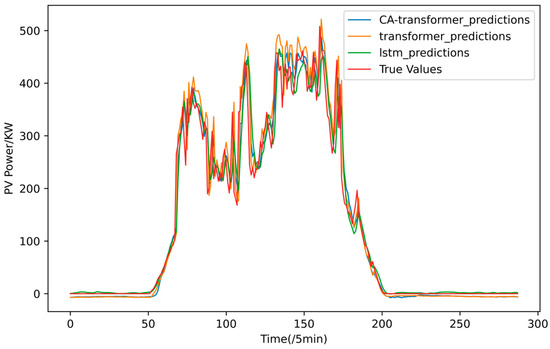 To further illustrate the predictive effect of the established photovoltaic power generation model based on the CA-Transformer, it is compared with models established based on LSTM and the Transformer. The RMSE, MAE, and R2 were used to quantitatively evaluate the prediction effects of each model, and the prediction errors of the test samples are shown in Table 4.