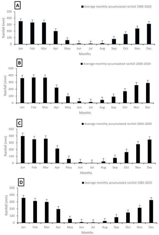 Conversely, the months with the highest indices were December, January, February, and March, and they regularly exceeded the average of 288 mm for all stations. Ref. [