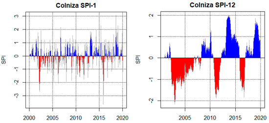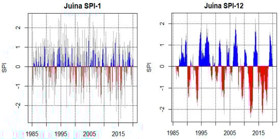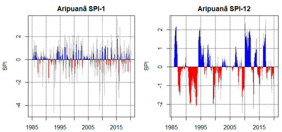 45], using the Climate Hazards Group InfraRed Precipitation with Station (CHIRPS) data between 1985 and 2018 for the municipalities of Cáceres, Cuiabá, Diamantino, Nova Xavantina, and Poxoréo in Mato Grosso, found moderately humid anomalies for SPI-12 that were identical to those found in the Colniza and Juína stations (2018); moderately dry for Aripuanã (2000, 2007) and Colniza (2013); and very dry conditions in Juína (1993). Ref. [