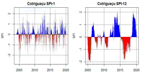 66] detected the occurrence of 10 drought events and 12 rainy events in 32 years in their historical series. The authors’ work corroborates the present study, in which 30 events were found on the SPI-1 scale in 17 years of observation in Cotriguaçu, the closest station to the south of Pará. The larger number of events in this study is due to the fact that the monthly scale is more sensitive than the six-monthly scale used by the previous authors. However, it is noted that the balance remains in the amount of dry and wet events that occurred in the comparison between the studies.