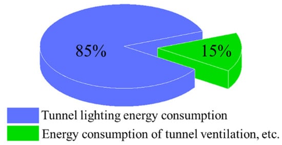 In addition to the above examples of tunnel lighting energy consumption, most of the road tunnels operating in China have varying degrees of energy consumption. Research shows that the energy consumption of tunnel lighting accounts for a relatively high proportion of the total energy consumption of tunnel operation. In 2016, the cost of lighting in China’s highway tunnels was as high as CNY 5.62 billion, and the energy consumption of tunnel lighting accounted for 85% of the total energy consumption of highway operation (Figure 1) [20].