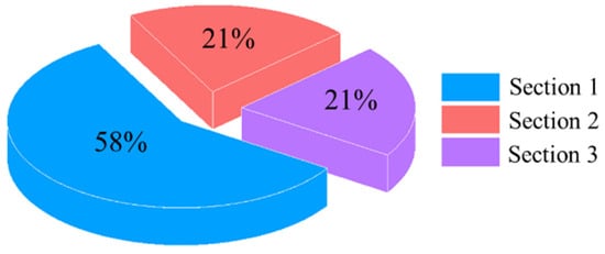 A highway tunnel is a special traffic structure, which has the characteristics of a limited width and a long vertical depth, forming a relatively closed space environment. The interior of a tunnel is unable to benefit from natural lighting due to environmental restrictions, leading to a range of visual issues for drivers and causing heightened anxiety, ultimately posing a serious threat to driving safety [21,22]. Lai [23] partitioned a tunnel into multiple sections in accordance with the Lighting Rules of Highway Tunnels and conducted the statistical analysis of traffic accidents occurring in each section. The spatial division of the tunnel is illustrated in Figure 2, while the distribution of traffic accidents across different sections is presented in Figure 3.