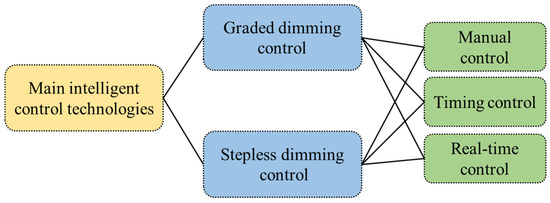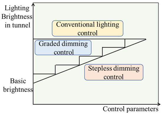 As the core of lighting engineering construction, intelligent control technology should be considered first to solve the energy consumption problem of tunnel lighting. At present, the intelligent control technology of tunnel lighting is mainly divided into graded dimming and stepless dimming (Figure 5) [27]. Some of China’s highway tunnel lighting control technologies are shown in Table 1.