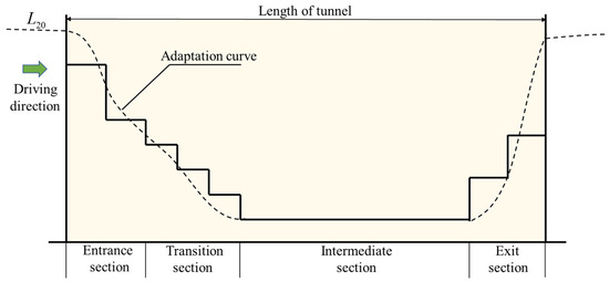 The basic principle of graded dimming control is to control the basic lighting in two separate circuits, i.e., two levels of control (a high traffic volume and a low traffic volume) [36,37,38], because the key determinant of the average luminance demand value of basic lighting is the traffic flow. Enhanced lighting is divided into four independent circuit control groups, i.e., four levels of control (sunny days, cloudy days, overcast days and heavily overcast days), because the average luminance demand value of enhanced lighting mainly depends on luminance outside the tunnel. The number of independent circuits for enhanced lighting should match the number of control levels, allowing for different levels of luminance in the tunnel to be achieved by opening or closing the corresponding lighting circuits. China’s current standard “Highway Tunnel Lighting Design Rules” divides the entrance and the intermediate section of the tunnel into a total of five lighting sections, entrance section 1, entrance section 2, transition section 1, transition section 2, and transition section 3, as shown in Figure 6. The actual demand function of luminance corresponding to each lighting section is shown as follows: