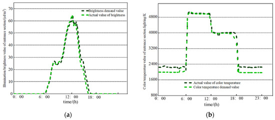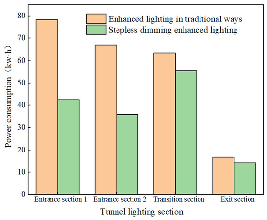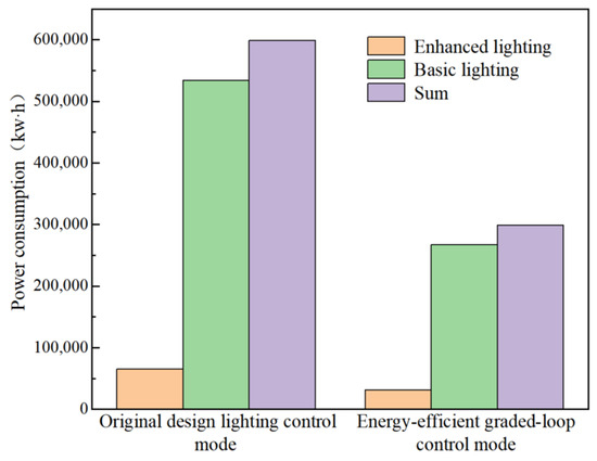 The comparison of enhanced lighting power consumption between the two lighting methods is shown in Figure 10. The calculation results indicate that the total power consumption of traditional enhanced lighting is 225.28 kW·h, while the total power consumption of sub-loop stepless dimming enhanced lighting is 148.29 kW·h. Energy consumption was reduced by 34.17%.