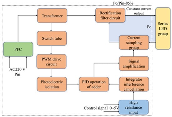 The stepless dimming control is a voltage-controlled current source (VCCS) luminance control method [40]. As shown in Figure 8, the control method directly samples the current signal, and then isolates it to amplify the duty factor of the primary switching tube of the control power supply. The isolation transformer isolates the electrical energy with different duty factors and converts it into a DC pulse current, which is filtered by a low-pass filter and converted into a DC current whose size varies with the control signal, thus controlling the output current of the power supply. The efficiency of this type of power supply with controlled output current is relatively high; with the addition of the Power Factor Correction (PFC) circuit, the general efficiency is about 85%.