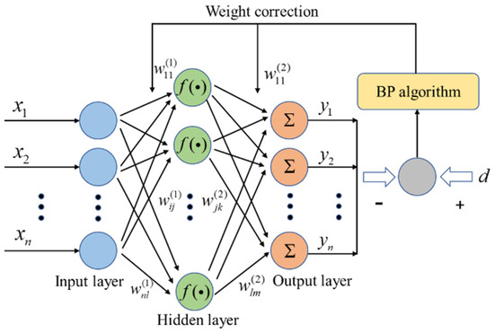Neural network algorithms do not require a specific mathematical model for the internal processes, but only need to collect enough input and output sample data to ensure a better ability to predict the results [49,50,51]. Among them, the BP neural network is by far the most widely used neural network, mainly applied to function fitting and pattern classification for the intelligent dimming of tunnel lighting. The BP neural network uses an error backpropagation training algorithm and has a total of three or more layers, namely the input layer, the hidden layer (middle layer) and the output layer. The corresponding structural diagram is shown in Figure 11. When the actual output does not match the expected output, the output error will be transmitted back layer-by-layer through the hidden layer in some form to the input layer, and the connection weights will be constantly corrected. With the forward propagation of the signal and the reverse propagation of the error cycle, the connection weights are constantly adjusted to reduce the error of the network output to an acceptable degree.