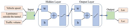 The luminance of the entrance section 1 and the intermediate section 1 of the highway tunnel is the key to the lighting design, and the luminance of all the other lighting sections can be converted according to the proportional relationship with the luminance of these two sections [45]. Among them, the luminance of the entrance section 1 is calculated by looking up the reduction coefficient k according to the vehicle speed and traffic volume, and then calculated by combining it with luminance outside the tunnel. The luminance of the intermediate section 1 only needs to be studied according to the vehicle speed and traffic volume. The internal conversion formulas are very complicated, and there is no precise formula for controlling the variable of vehicle speed. There is currently no linear mapping between tunnel luminance and vehicle speed, traffic volume and luminance outside the tunnel. A mathematical theory has shown that neural networks can implement any complex non-linear mapping, so neural networks can be used to solve algorithmic problems for tunnel lighting dimming [46,47,48].