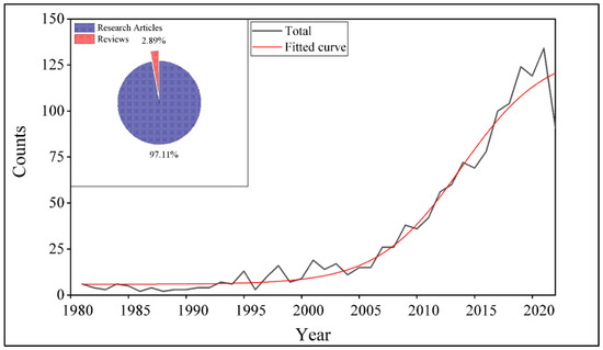 From 1981 to 2022, WOS published 1384 PWG-themed publications, comprising 1343 research articles (97.04%) and 41 reviews (2.96%) (Figure 1). These articles were cited 34,374 times, with an average of 24.78 citations per article. The number of publications on PWG shows an increasing annual trend (Figure 1). The number of studies published before 1994 was minute, with only 10 annual publications worldwide. Slow growth was experienced between 1994 and 2006 (6 to 15 publications, with an average annual growth rate of 8.32%). The last 15 years have seen a dramatic increase in the number of publications per year (more than 89% of all publications), reaching 134 in 2021, with the number expected to exceed 150 in 2022. Due to increasing concerns about climate change as well as carbon peaking and carbon neutrality goals, the number of citations of papers about petrochemical industry waste gas increased between 1981 and 2022, with two remarkable leaps in climate change and carbon sink research in 2005 and 2020. These trends reflect the increasing attention devoted to this area during the past decade [20,21,22].