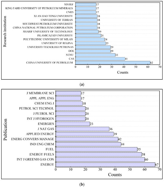 The first paper on PWG was published in June 1981 by Acta Technica Academiae Scientiarum Hungaricae [29], 18 years before the first PWG study in China (The CO2 Reforming of Natural Gas in a Pulsed Corona Discharge Reactor) [30]. Subsequently, countries began to focus on PWG research. The results of an institutional analysis show that a total of 200 institutions participated in the study of PWG. Institutions with a total of more than 17 publications are presented in Figure 2a (15 institutions in total; Table 2 shows detailed information on the top 10 institutions, and Southwest Petroleum University is in 10th place). There are three institutions from China, two from Iran, and one each from Norway and the United States. Since 2003, Norwegian institutions have had the third-highest number of publications and the highest quality of papers and research impact. The H-index of the institutions was 44.15, indicating that Norwegian researchers attach great importance to PWG research.