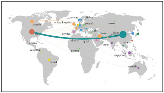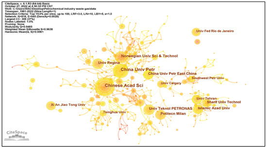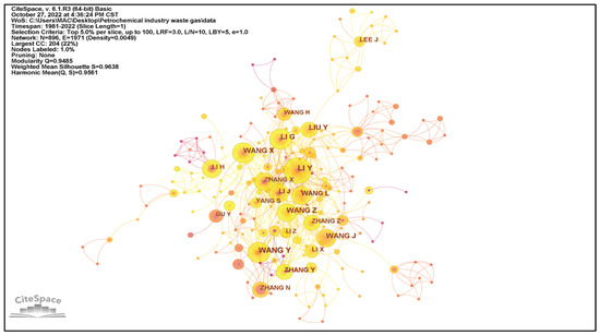 Between 1981 and 2022, a total of 75 countries/regions participated in the publication of PWG thematic papers (Figure 3). The larger the node, the greater the number of publications in a region and the stronger the cooperation between countries. Global research was concentrated in the United States, Asia, and Europe. European countries are geographically adjacent, so if large-scale petrochemical exhaust pollution occurs, the cross-border pollution effect will inevitably affect the environment of the neighboring countries. Also, the establishment of the EU Environment Agency has provided a large data-sharing platform for its member states, which is conducive to scientific research cooperation among countries [31]. China and Iran are prominent in Asia. As shown in Table 1, China and Iran rank first and fifth, respectively, in the number of published articles. Iran has the third-largest oil reserves in the world and was one of the first countries to develop a petrochemical industry in the Middle East. Furthermore, Iran has the second-largest petrochemical industry in the Middle East. The country’s petrochemical industry has grown exponentially over the past 40 years, and this growth has led to an increased environmental burden. Scholars have conducted in-depth studies on environmental risk assessment, energy efficiency, and the emission reduction potential of the petrochemical industry in order to improve the environmental and economic benefits of Iran’s petrochemical industry [32,33,34].