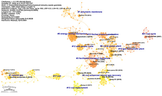 Others describe treatment technologies for petrochemical exhaust gases: a range of treatment technologies exist, including CCS, low-temperature CO2 capture, amine capture, bioremediation, and smart manufacturing technologies designed to optimize processes to reduce emissions. Bui M et al. explored the potential of CCS to mitigate climate change and discuss the challenges of its deployment [51]. Carbon dioxide capture mainly consists of five technologies: membrane, absorption, adsorption, cryogenic distillation, and chemical looping. Recently, many efforts have been made to optimize the carbon dioxide adsorption process, reduce energy consumption, thereby reducing operational costs, and develop sustainable adsorbents for carbon capture. Song CF et al. highlighted the latest developments in cryogenic CO2 capture technology, including its challenges and future opportunities [52]. Biliyok, Chet demonstrated the effectiveness of amine-based CO2 capture technology in waste-to-power plants [3]. Singh P et al. reviewed the biological treatment methods of petrochemical wastes, with emphasis on bacterial degradation [56]. Yuan ZH et al. discussed how smart manufacturing can change the petrochemical industry through enhanced connectivity and optimization [57]. Luo XB et al. proposed a more efficient way to recover ethylene from refinery dry gas [54]. In addition, VOCs as a key emission pollutant in the petrochemical industry have also been studied in depth. For example, Zheng YF et al. introduced a novel catalyst for the removal of volatile organic compounds (VOCs) from industrial emissions [53]. Huang YZ et al. used direct-access mass spectrometry to monitor and identify VOCs in chemical parks [55]. Most articles conclude that processing techniques are available, but challenges remain in scaling these solutions from laboratory settings to practical applications. Factors such as cost, efficiency, and adaptability to different types of emissions need to be addressed. Co-citation analysis is useful and relevant for identifying cited articles and important documents that make up the core knowledge system of a particular domain.