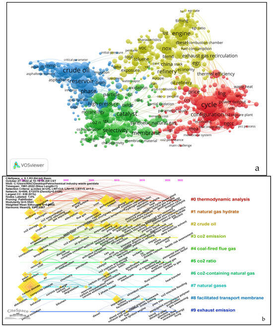 Keywords can provide important information about the core content, which is of great significance to the understanding of the research model, the overall research focus direction, and the research gap [60]. Figure 7a shows a co-occurrence network diagram of keywords used in research articles related to PWG. Co-occurrence research on frequently used keywords is essential for people to read publications on current and past research issues. According to VOSviewer statistics, there were 473 keywords in 1384 articles over the past 42 years, with 10 keywords appearing more than 80 times. In this study, the minimum keyword frequency was set at 35, as shown in Figure 7a. To facilitate the identification of research clusters, the collected keywords from different authors were categorized into four color groups based on research field similarity. Connecting lines indicate a close relationship between two items, while a large-sized node indicates a high occurrence rate of an item. Keyword distance clustering, clustering, and density distribution are shown in Figure 6 and Figures S1–S3. We found that the keywords with the largest nodes, the highest density, and the highest frequency include “crude oil” (225), “VOCs” (165), “gas storage tank” (139), “circulation” (106), and “catalyst” (105). This finding is consistent with our research theme and shows that the source and treatment processes of PWG are the focus of water environment research. Other keywords such as “nitrogen oxides”, “carbon dioxide”, “phase”, “selectivity”, “structure”, and “exhaust gas” were in the cluster groups. Combined with cluster groups, PWG studies mainly include components of exhaust gas emitted by the petrochemical industry, petrochemical industry waste gas treatment methods, and the waste heat utilization of petrochemical industry waste gas. To some extent, these PWG studies reflect the diversity and complexity of PWG research.