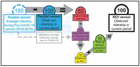 The methodology to calculate displaced cyclists and pent-up demand is depicted in Figure 2. By subtracting the observed ridership in the current period from the average ridership during the pre-COVID-19 period, we obtained the drop in actual ridership, shown in red. We could then compare this drop with the expected loss in ridership due to the COVID-19 pandemic, illustrated in purple, that would be measured if the sensors’ count declined at the same rate as that of the average ridership measured by the control sensors. The difference between the actual drop in cycling ridership and the loss expected due to the pandemic is referred to as displaced cyclists, depicted in yellow. By subtracting this group of cyclists from the corresponding REV sensors’ ridership count, we obtained the pent-up demand for safe cycling infrastructures, illustrated in green.