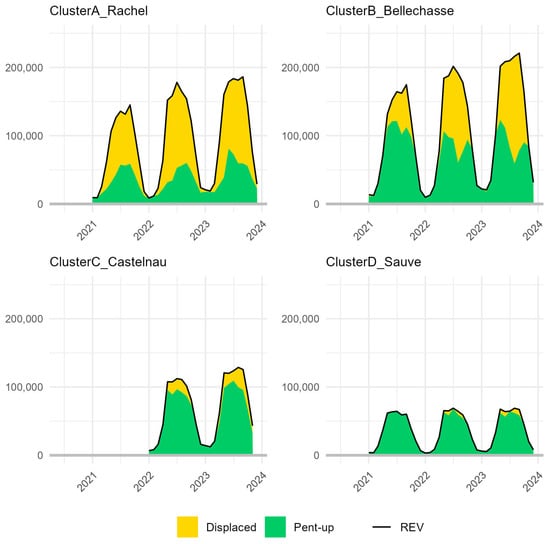 As shown in Figure 3, the sensors positioned along the REV in Clusters A and B exhibited significantly higher ridership compared to those in Clusters C and D, which we attributed to their proximity to downtown and other major cycling routes. Clusters A and B also showed a higher share of displaced cyclists, but when looking at the number of cyclists comprised within the pent-up demand, we found that the REV sensors located in Clusters B and C generated most of the pent-up demand (accounting for over 100,000 counts during some months in 2023 and 2021 in the case of Cluster B). More details on the number and proportion of cyclists comprised within the displaced and pent-up demand categories per REV sensor over time are provided in Table 4.