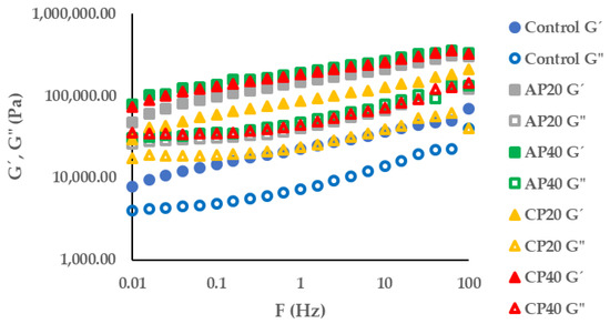The small amplitude oscillatory shear (SAOS) rheology measurements were conducted using a rheometer (Haake Mars III—Thermo Scientific, Dreieich, Germany) with a UTC—Peltier system to determine the viscoelastic properties of the dough, with and without APF and CPF, at 20 °C. The stress sweep test at 1 Hz was performed for the determination of the linear viscoelastic region to select the critical stress to be applied during the SAOS measurements. Then, the frequency sweep test allowed the acquisition of the storage (G′) and loss (G′′) moduli at frequencies ranging from 0.01 Hz to 100 Hz, while maintaining a constant shear stress within the linear viscoelastic region of each sample. Each sample (control; AP20; AP40; CP20 and CP40) was placed in the bottom plate of a 20 mm serrated parallel plate (PP20) with a 1 mm gap. To stop moisture loss during testing, liquid paraffin was applied to the sample edges. Each formulation was tested at least in triplicate.