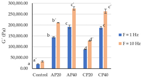 Storage modulus of cracker doughs with apple and carrot pomace at frequencies of 1 and 10 Hz. Results are expressed as average ± standard deviation of triplicates (n = 3), followed by an alphabet letter. Different letters mean significant different results (Tukey’s HSD; p ≤ 0.05).