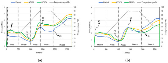 The Mixolab Chopin+ protocol [50] was performed to evaluate the influence of incorporating apple and carrot pomace flours at different levels on the mixing and pasting behavior of the mixture of wheat flour and pomace flour at a constant water absorption level (55 g/100 g) (Figure 3). This method determines the consistency of dough as the torque exerted by the dough on the kneading pieces, reproducing the overall processing during kneading and the first part of baking to follow the behavior of the protein matrix at a constant temperature (30 °C), followed by the role of starch by applying temperature profile heating at about 90 °C, and subsequently cooling down to 50 °C. The decision to use constant water absorption was taken to allow us to compare the behavior of the different dough systems.