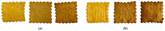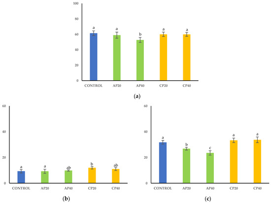 The color parameters of crackers: (a) lightness (L*), (b) balance between redness and greenness (a*), (c) balance between yellowness and blueness (b*). Results are expressed as average ± standard deviation (n = 10), followed by an alphabet letter. Different letters mean significantly different results (Tukey’s HSD; p ≤ 0.05).