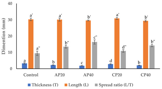 The characteristic dimensions, width (W) and thickness (T), of 10 crackers from each formulation were measured using a digital caliper model 684132 (Lee Tools, Housten, TX, USA). The spread ratio (W/T) was calculated accordingly.