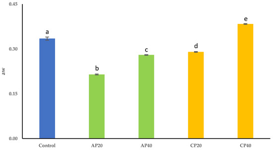 Evaluation of the water activity (aw) of crackers. Results are expressed as average ± standard deviation (n = 10), followed by an alphabet letter. Different letters mean significantly different results (Tukey’s HSD; p ≤ 0.05).