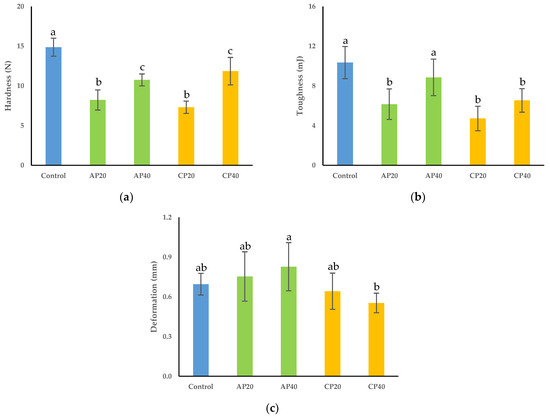 The results of texture parameters of crackers: (a) hardness, (b) toughness, and (c) deformation. Results are expressed as average ± standard deviation (n = 10), followed by an alphabet letter. Different letters mean significantly different results (Tukey’s HSD; p ≤ 0.05).