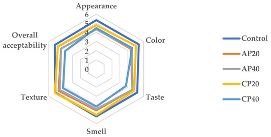 Sensory analysis trials were carried out on samples with 20 and 40% AP and CP pomace flours and the control. Figure 9 represents the average scores of the sensorial parameters, as evaluated by the panel.