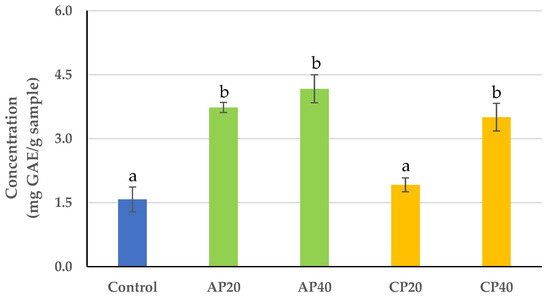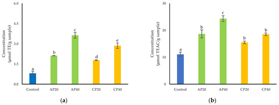 The TPC was evaluated on the ethanolic extracts of crackers, as shown in Figure 11. The TPC found in all the crackers’ formulation was significantly different (p > 0.05) when compared to the control crackers (1.2 mg GAE g−1), except for the CP20 formulation, showing a TPC similar to the one found in the control. This might be due to the lower TPC and antioxidant activity found in the carrot pomace flour used in the preparation [62]. When increasing pomace flour content from 20 to 40% the TPC significantly increased from 3.7 to 4.2 mg GAE g−1 (p < 0.05) when using apple pomace flour and from 1.9 to 3.5 mg GAE g−1 when using carrot pomace flour.