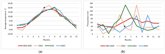 Weather conditions from 1991 to 2020 and the years of the experiment 2021, 2022, and 2023. The average temperature of the months (a) and total monthly precipitation (b). The sowing time of the seeds is marked with an asterisk.