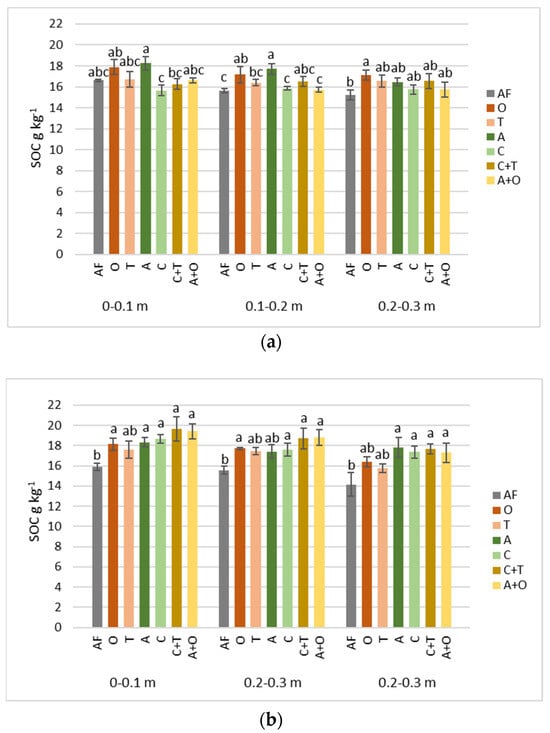 SOC content as influenced by different perennial plants and their mixtures in 0–0.1, 0.1–0.2, and 0.2–0.3 m soil depth after the first (a) and third (b) years of vegetation. AF—arable field, O—tall oat grass, T—timothy grass, A—alfalfa, C—red clover, C + T—red clover + timothy grass, A + O—alfalfa + tall oat grass. Note. Significant differences in SOC (g kg−1) among various perennial plant species and their mixtures are shown at p ≤ 0.05 using letters; error bars are shown as the standard error (SE) of the mean.
