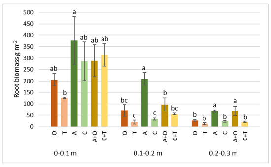Roots’ biomass of different perennial plants and their mixtures at 0–0.1, 0.1–0.2, and 0.2–0.3 m soil depth at the end of the second growth year. O—tall oat grass, T—timothy grass, A—alfalfa, C—red clover, C + T—red clover + timothy grass, A + O—alfalfa + tall oat grass. Note. Significant differences in root biomass (g m−2) among various perennial plant species and their mixtures are shown at p ≤ 0.05 using letters; error bars are shown as the standard error (SE) of the mean.