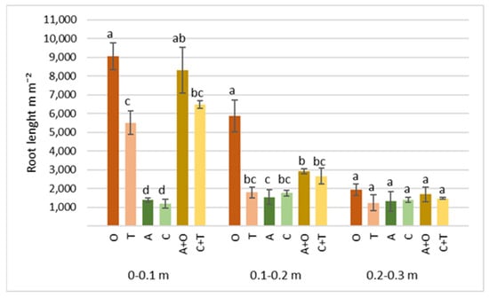Roots’ length of different perennial plants and their mixtures at 0–0.1, 0.1–0.2, and 0.2–0.3 m soil depth at the end of the second growth year. O—tall oat grass, T—timothy grass, A—alfalfa, C—red clover, C + T—red clover + timothy grass, A + O—alfalfa + tall oat grass. Note. Significant differences in root length (m m−2) among various perennial plant species and their mixtures are shown at p ≤ 0.05 using letters; error bars are shown as the standard error (SE) of the mean.