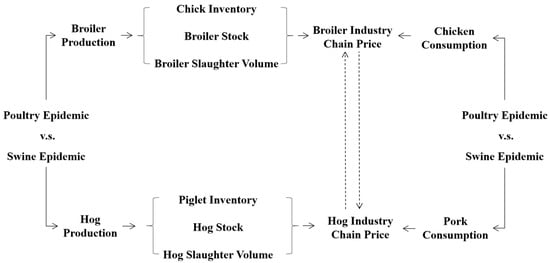 From a supply perspective, the deaths and culling of pigs and poultry during sudden epidemics have a direct impact on current stocks, resulting in significant financial losses for breeders. This may prompt some breeders to scale down production to reduce epidemic prevention costs, potentially forcing smaller enterprises with limited risk capacities to exit the market [25,29,33]. Comparatively, swine epidemics like African swine fever have a more substantial effect on hog production than poultry epidemics such as avian influenza on poultry production. Due to fixed production cycles for both pigs and poultry, exclusive of external trade factors, their supply cannot be quickly increased in the short term [30]. Information related to epidemics influences breeders’ decisions, affecting hog and poultry stock levels as well as slaughter volumes. During poultry and swine epidemic outbreaks, most entities and breeders tend to be cautious, postponing stock replenishment until the epidemic stabilizes [31]. This will result in prolonged supply–demand gaps and subsequent price increases for hogs due to the long production cycle of hogs. Conversely, the shorter production cycle of poultry leads to a rapid increase in supply when positive epidemic control news is disseminated, causing a temporary surge in poultry stocks.