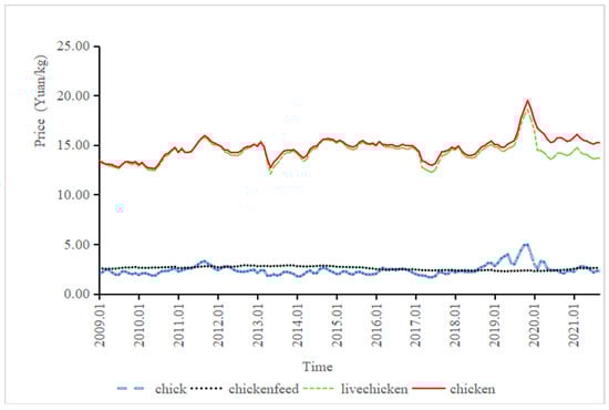 The trends in broiler chick, broiler feed, live chicken, and chicken meat prices in China from 2009 to 2021 are depicted in Figure 2. The prices of broiler chicks, live chickens, and chicken meat exhibit notable fluctuations with similar patterns, while broiler feed prices remain relatively stable with minor fluctuations.