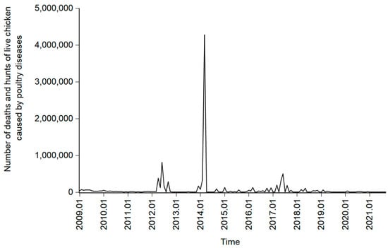 The monthly number of deaths and hunts of live chickens caused by poultry diseases from 2009 to 2021 in China. Source: BricBigData (https://www.agdata.cn, accessed on 28 February 2024).