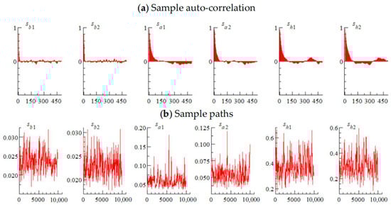 In this study, Nakajima’s research served as the basis for the selection of a reliable sample for the TVP-VAR model. Through the implementation of the Markov Chain Monte Carlo (MCMC) method, 10,000 simulated samples were generated, with the initial 1000 samples being discarded [38,39]. The MCMC estimation outcomes (See Table 3) indicated that the posterior means of all parameter tests fell within the 95% credibility intervals, and the Geweke convergence diagnostic values were notably below the critical value of 1.96 at a significance level of 5%, which meant that the parameters achieved convergence with the posterior distribution; thus, the MCMC sampling exhibited a high level of concentration [35]. In addition, the maximum inefficiency factor was 43.93, well below the sample size, which implies that the number of iterations employed in the estimation was adequate for achieving stable results [44].