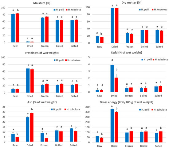 Comparison of the proximate compositions of the various processed products between H. polii and H. tubulosa. Bars represent means ± st. deviation (n = 3). For each processed product, bars not sharing a common superscript are significantly different (p < 0.05) between the two species.